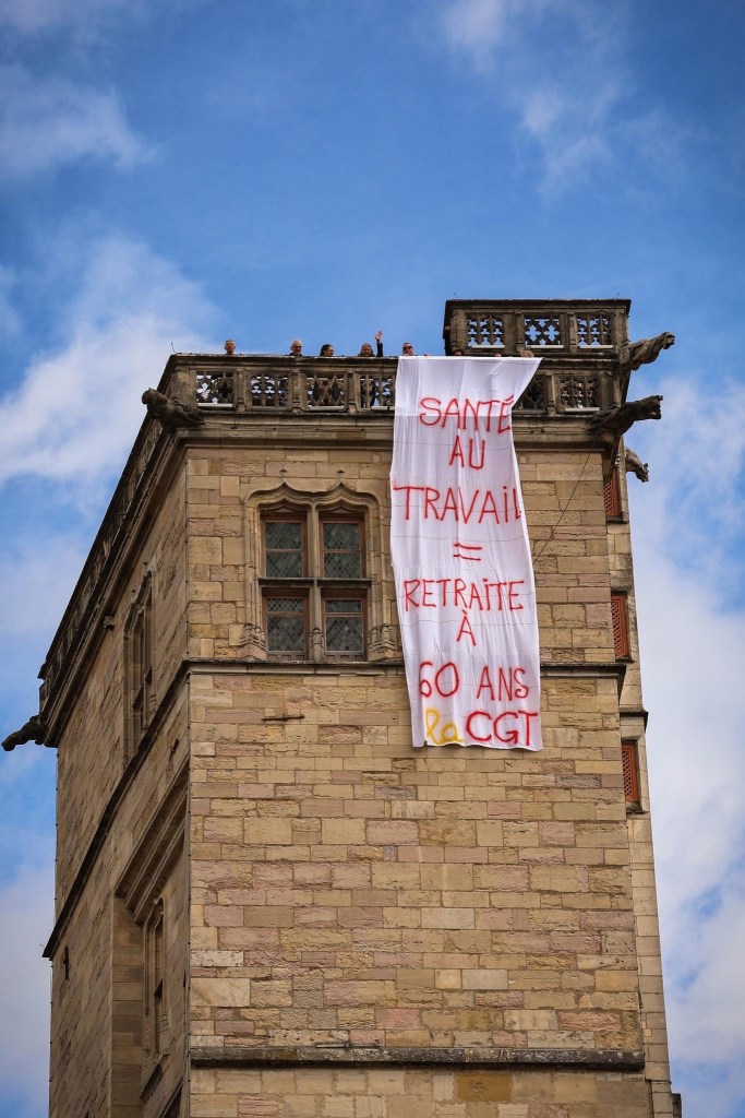 Face à l’obstination du président et du gouvernement, nous ne lâcherons pas. A l’image de cette banderole déployée sur les murs de la tour Philippe le Bon par la CGT vendredi 28 avril dernier :