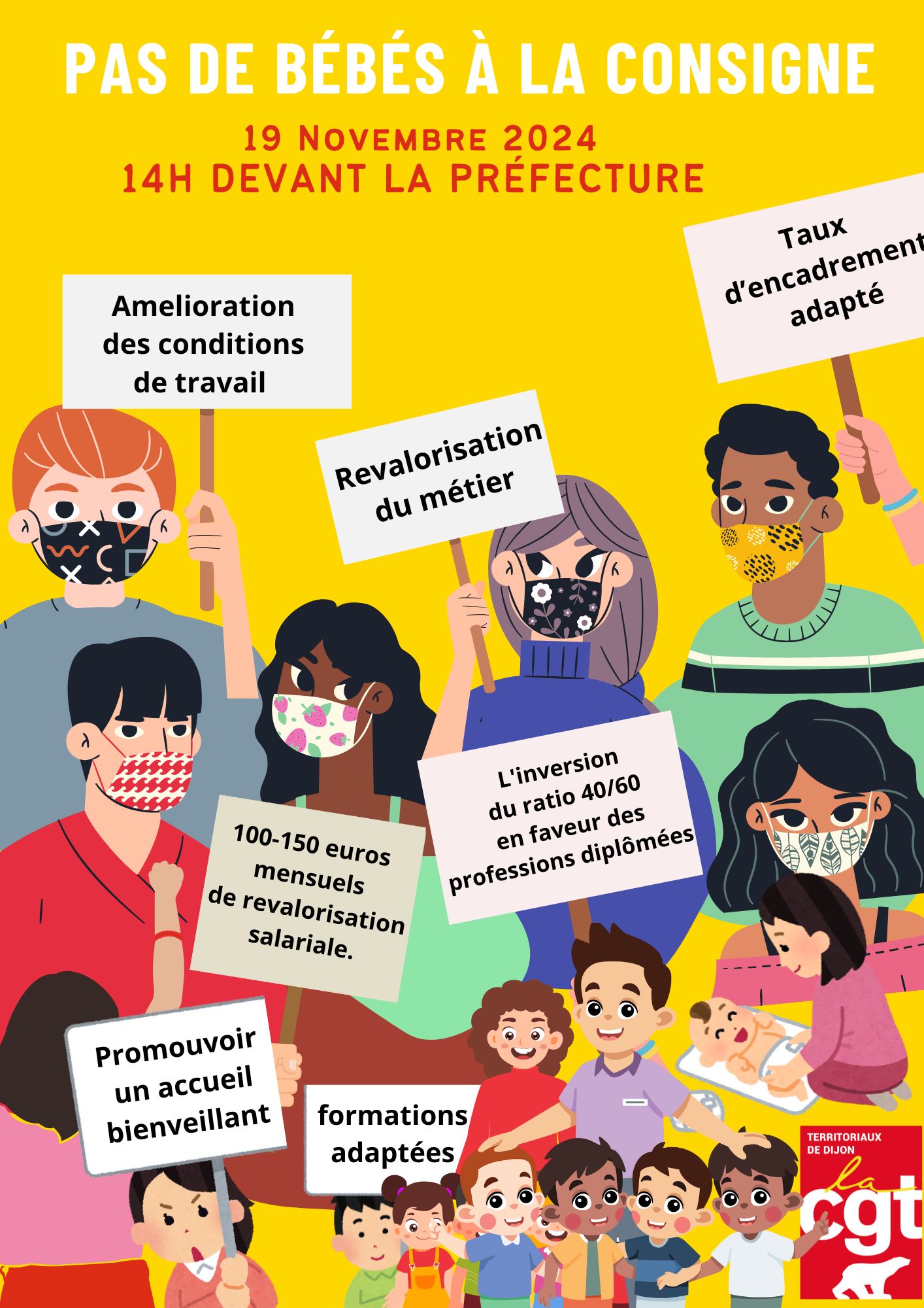 - Rue de la Préfecture à 14h avec le collectif « Pas de Bébés à la consigne » pour la revalorisation des salaires et l’amélioration des conditions de travail des agent.e.s de la petite enfance.