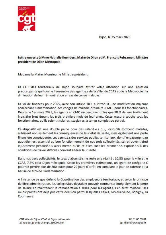 La CGT des territoriaux de Dijon souhaite attirer votre attention sur une situation préoccupante qui touche l’ensemble des agent.e.s de la Ville, du CCAS et de la Métropole : la diminution de leur rémunération en cas de congé maladie.